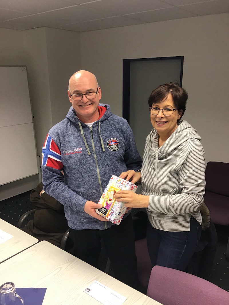 Andreas Kappelhoff und Steffi Deitermann gratulieren Ralf mit einem Paket "Nervennahrung".