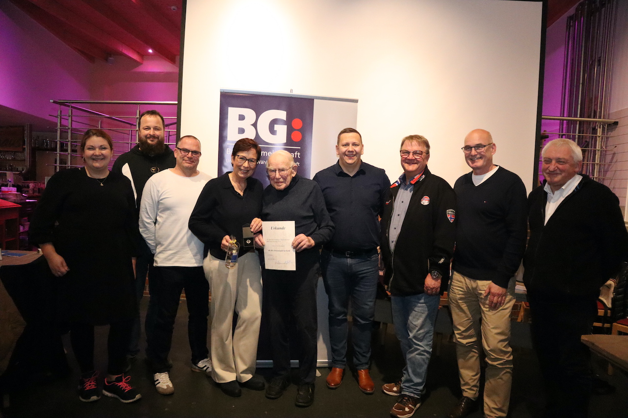 Foto links: Vorstand alt/neu mit Jubilar Fritz Kleegräfe bei der Jahreshauptversammlung 2025 im Sudhaus/ Aloisius.